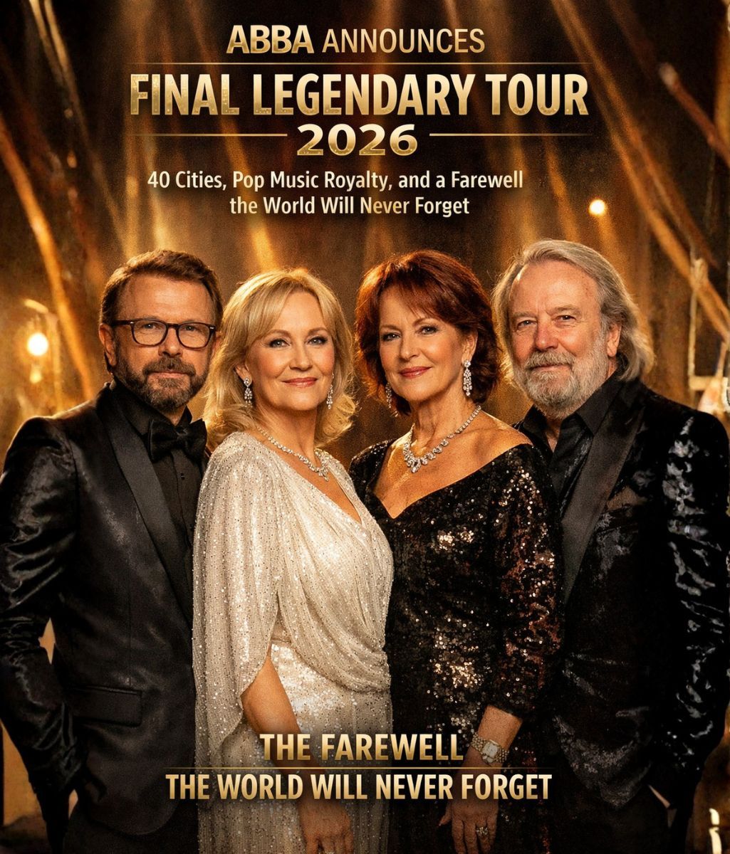 The announcement arrived without excess, but its impact was immediate and unmistakable. ABBA have officially confirmed what many hoped for and quietly feared — a final legendary world tour in 2026, spanning 40 cities and marking the last time the world will gather to hear these voices together on a global stage.