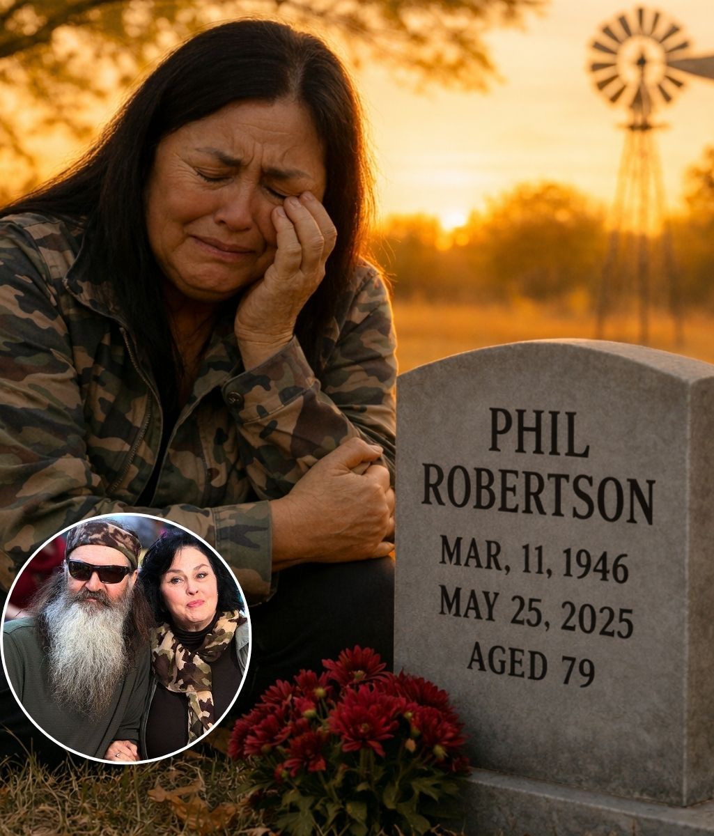 The Louisiana sky hung low and gray that morning, the kind of sky that seems to carry the weight of memory. Beneath its soft, muted light, Kay Robertson sat alone beside a simple headstone. Her hand rested gently against the carved letters that bore the name she had spoken with love for nearly her entire life: Phil Robertson.