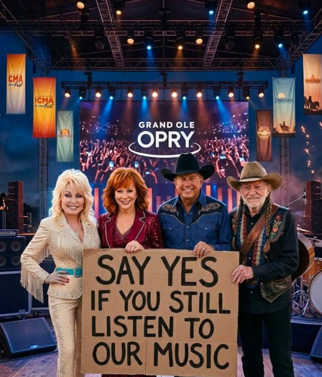 Standing side by side were Dolly Parton, Reba McEntire, George Strait, and Willie Nelson — four voices that have shaped the heart of country music across generations. It was not simply a gathering of stars. It felt more like a living monument to the genre itself.