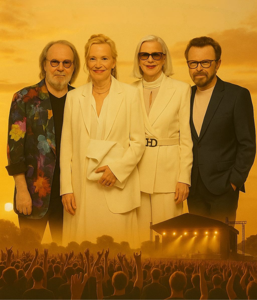 When the lights dimmed, the audience rose instantly — not to applaud, but to honor. Agnetha Fältskog, Anni-Frid Lyngstad, Benny Andersson, and Björn Ulvaeus emerged slowly, each step carrying the weight of more than five decades of music that shaped generations. There were no dancers, no special effects — only four figures under a soft golden glow, standing shoulder to shoulder as they once did when the world first learned their names.