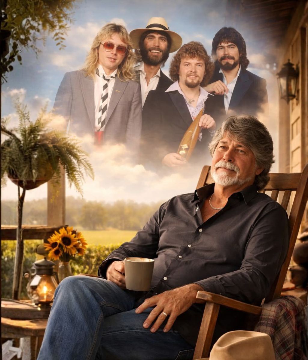 In one such image, Randy Owen sits quietly on the porch of a wooden home, a warm cup resting in his hands. His hair has turned gray, his posture softer than it once was under arena lights. Before him stretches an open field washed in late-afternoon gold. Behind him — almost like a reflection in memory — stand the younger versions of himself, Teddy Gentry, and Jeff Cook.