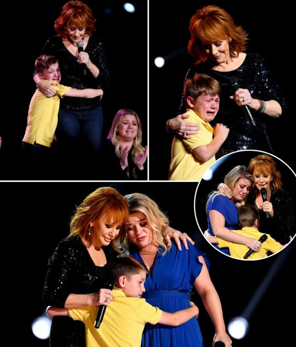 On a dimly lit stage, with the music suddenly gone and the air thick with something no one could quite name, Reba McEntire knelt beside a small figure holding a microphone just a little too big for his hands.