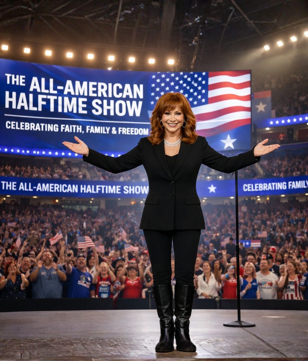 In this imagined timeline, social media ignites as Reba McEntire confirms her appearance at a parallel broadcast titled “The All-American Halftime Show,” set to air opposite Super Bowl LX.
