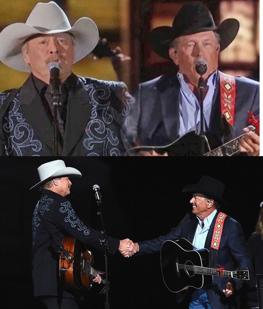 The performance began quietly, with George strumming the familiar opening chords that have defined his legacy for over four decades. The audience roared, then fell into reverent silence as Alan stepped to the mic, tipping his hat with that easy smile of his. Their voices met like old friends — George’s smooth Texas drawl blending perfectly with Alan’s deep, steady tone. It wasn’t just a duet. It was a conversation between two storytellers, both shaped by the same dust, highways, and heartache that built country music itself.
