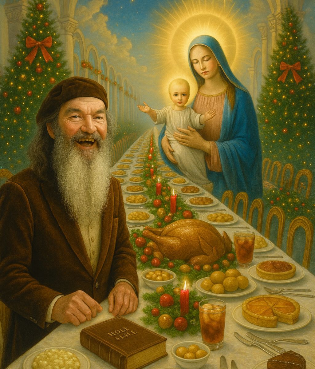 Phil Robertson opening his eyes to his very first Christmas morning in Heaven.