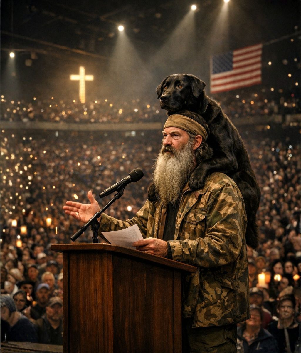 Phil Robertson did not speak immediately. He did not gesture. He did not command attention. Yet the crowd leaned in, as if something deeper than sound was taking place. The dog remained motionless, its presence grounding the scene in something ancient and wordless — loyalty without condition, companionship without explanation.