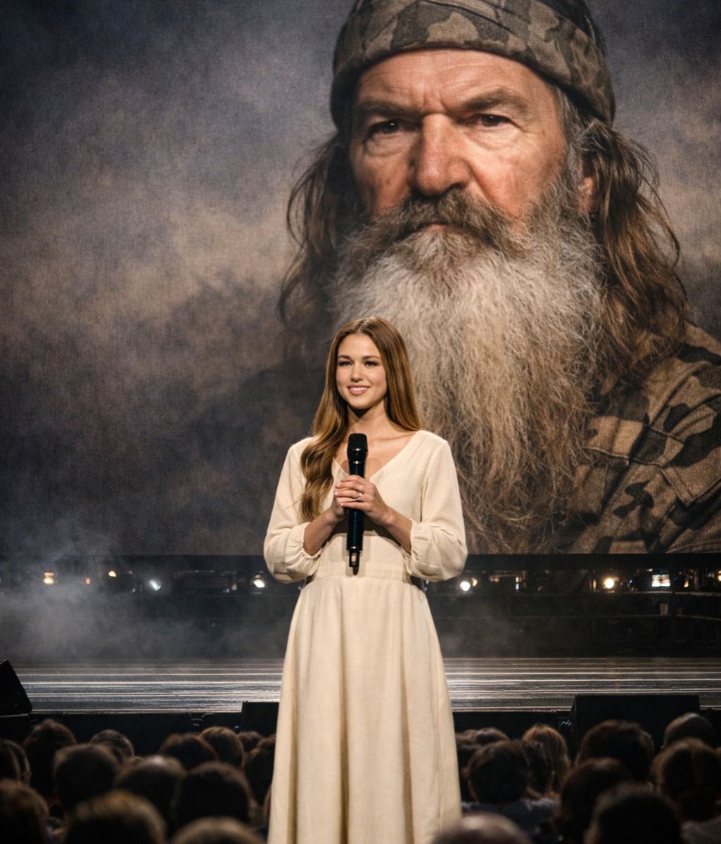 She did not rush. She did not raise her voice. She stood still — long enough for the silence to settle — and then she spoke of her grandfather, Phil Robertson.
