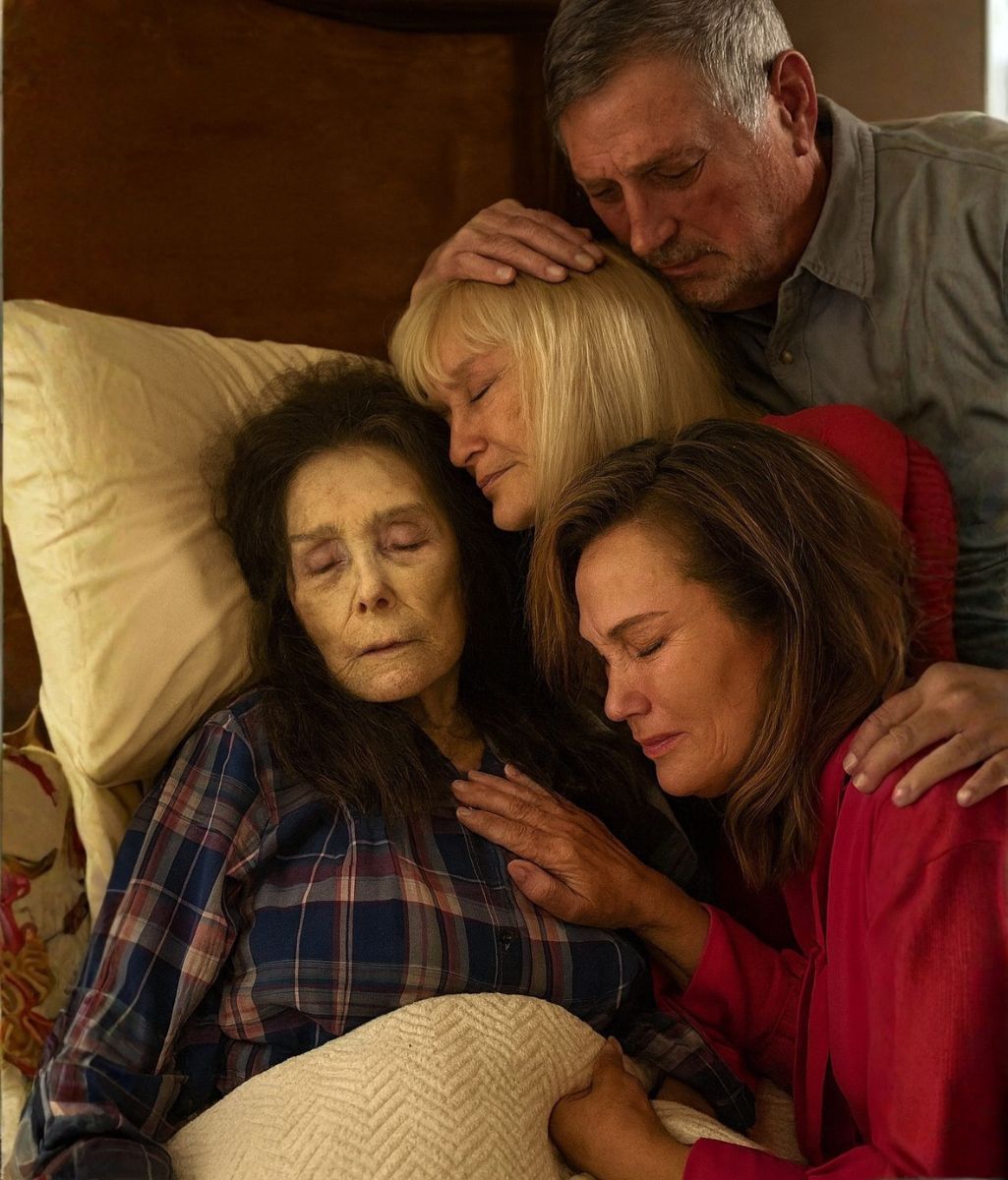 She lies peacefully, her expression calm, her hands clasped as if holding onto something unseen but deeply known. Around her are her children — not as an audience, not as caretakers of a legacy, but simply as sons and daughters bearing witness to the final quiet moments of the woman who raised them. There is no drama in the room. Only closeness. Only love.